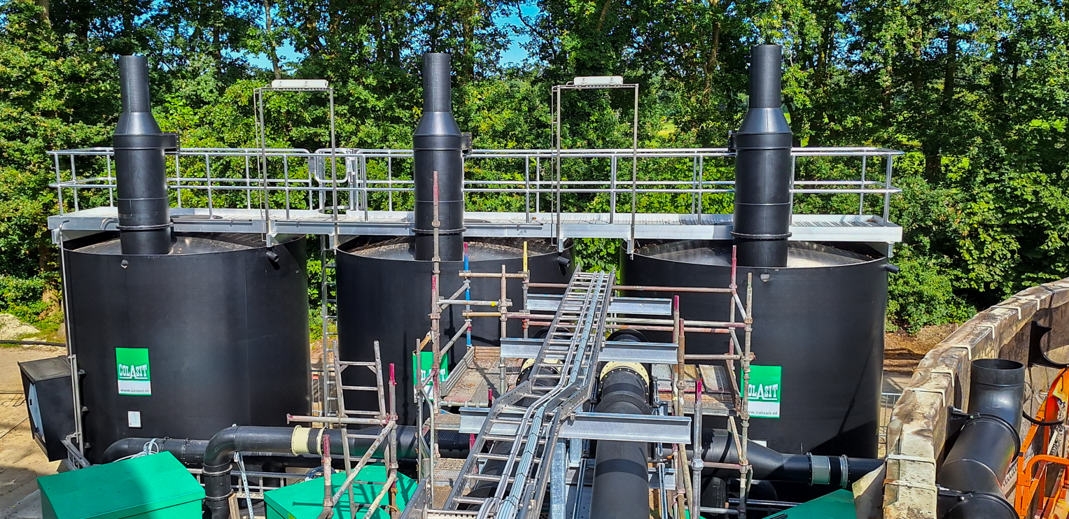 The Colasit CLF lava filter, which is used as a biofilter for the biological purification of corrosive air flows, is designed and manufactured in accordance with the requirements. Lava filters are used in sewage treatment plants for the purification of H2S, for example.